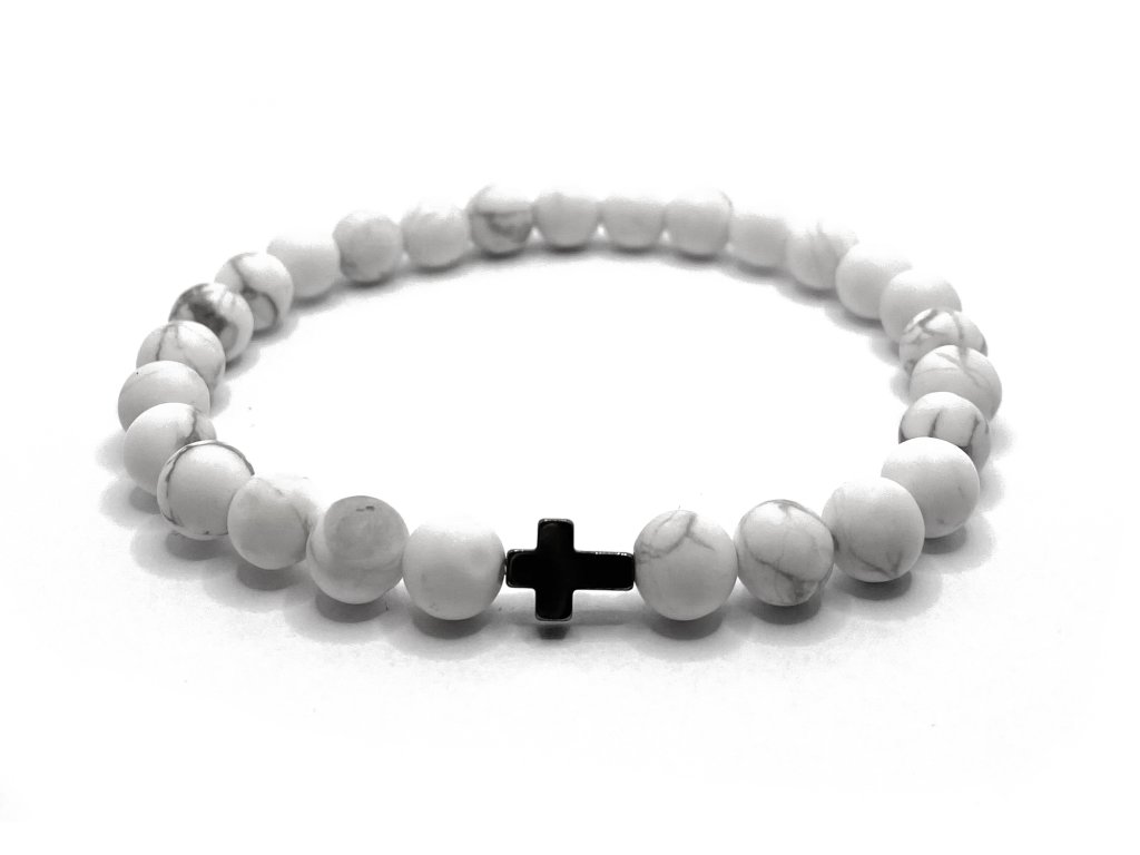 Stylový náramek s křížem z hematitu a korálky z bílého howlitu je výrazný, ale zároveň jemný doplněk pro každodenní nošení. Hematitový kříž vyniká svým kovovým leskem a symbolikou ochrany, síly a stability. Tento kámen je známý svou schopností uzemnit energii, posílit vůli a podpořit koncentraci.